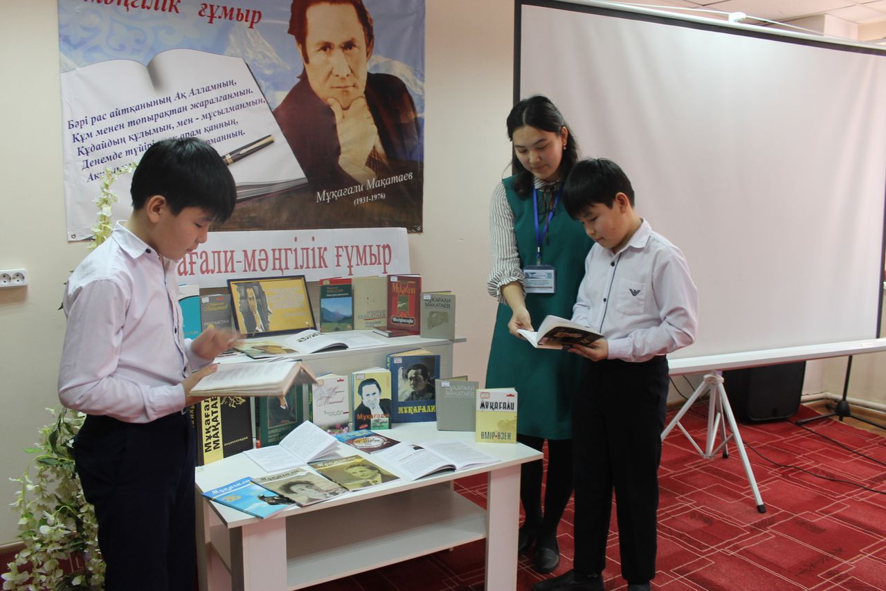«Мұқағали – мәңгілік ғұмыр» атты кітап көрмесіне Мұқағали Мақатаевтың жыр жинақтары, өмірі және шығармашылық жолынан сыр шертетін кітаптар мен баспасөз материалдары қойылып, библиографиялық шолу жасалды. Тақырыпқа сай слайд көрсетілді.
