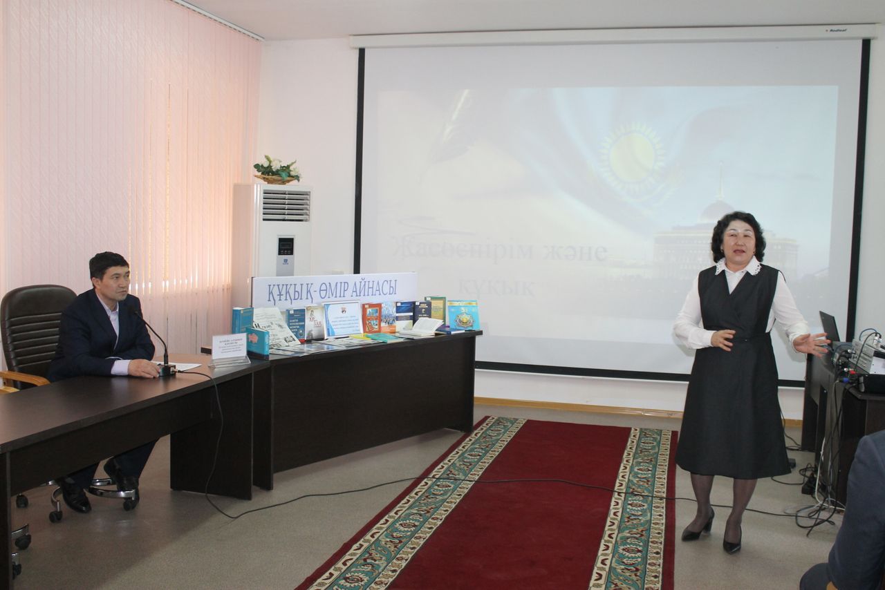 Была организована книжная выставка «Құқық өмір айнасы», на которой была представлена литература, газеты, журналы, статьи по данной теме, которые имеються в фонде библиотеки. Был показан слайд, соответствующий теме. В мероприятии приняли, библиотекари и студенты колледжа.
